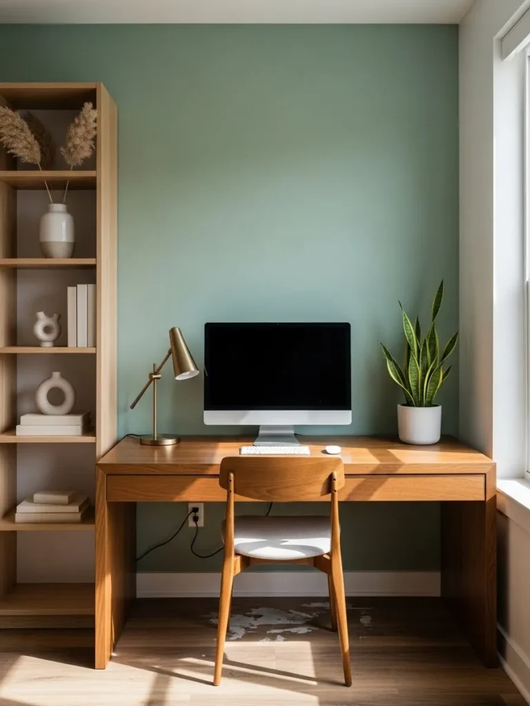 This sage green home office keeps things beautifully simple with a soft muted green wall that instantly calms the space. The clean lined wooden desk adds warmth without feeling heavy, while the matching chair keeps the look cohesive and unfussy. Natural light pours in from the side window, bouncing gently off the sage wall and making the room feel open and airy. A slim desk lamp, a single potted plant, and an open shelving unit with neutral decor give the space personality without clutter, which makes it perfect for focused work days.
