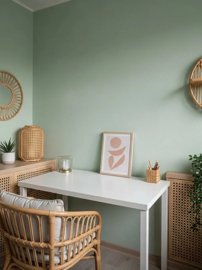 This sage green home office feels light, calm, and beautifully balanced thanks to its soft green walls paired with warm natural textures. The clean white desk keeps the space looking fresh and uncluttered, while the rattan chair and woven storage cabinets add instant warmth and character. Simple wall decor, soft greenery, and minimal accessories keep everything feeling intentional without being overstyled. The overall vibe is relaxed and airy, perfect for a space that needs to feel peaceful but still put together.