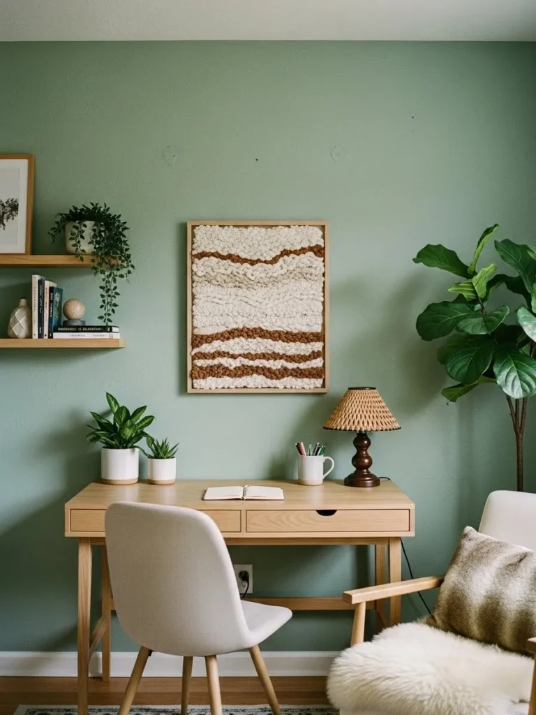 This sage green home office feels calm and thoughtfully styled without trying too hard. The muted green walls create a soothing backdrop that pairs beautifully with the light wood desk and chair. Natural textures really shine here from the woven wall art to the cozy throw and potted plants that add life without clutter. The overall look is clean and airy but still warm which makes it feel like a space you actually want to sit in for hours. Everything feels balanced and intentional from the simple shelves to the soft lighting that keeps the room feeling gentle rather than stark.