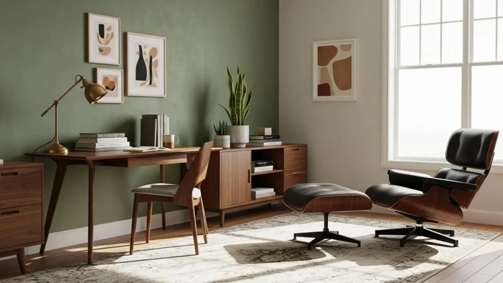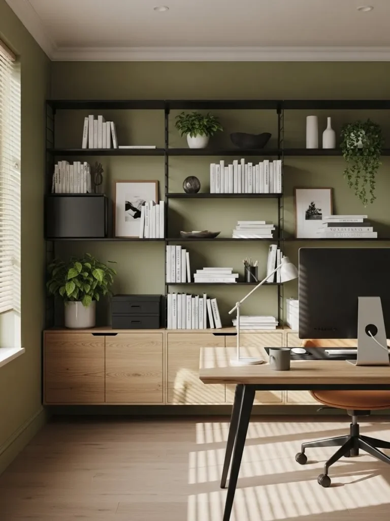 I honestly love how peaceful this office feels without trying too hard. It’s the kind of space that makes sitting down to work feel less like a chore and more like a quiet little ritual. The sage green walls paired with light wood give it that soft Pinterest worthy vibe that feels modern yet cozy at the same time. I can totally imagine sipping my morning coffee here and actually looking forward to opening my laptop, which says a lot.