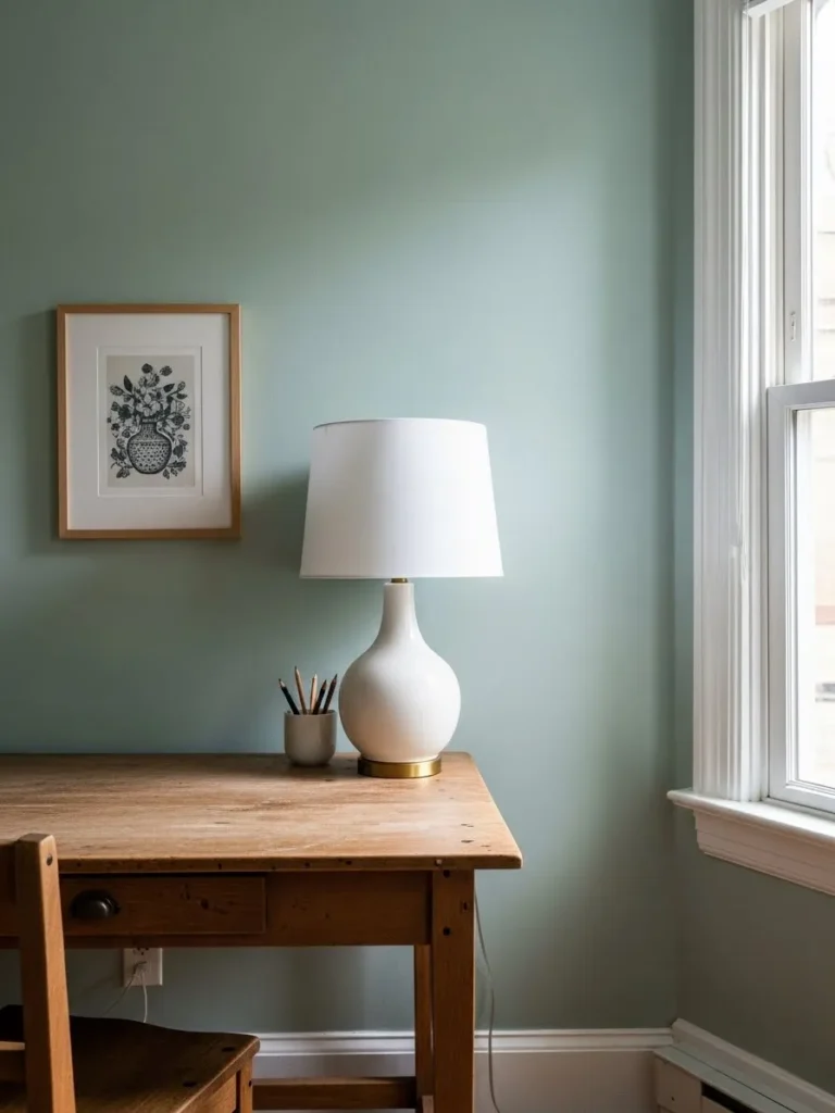 This home office keeps things calm and uncomplicated with soft sage green walls that instantly make the space feel light and breathable. The natural wood desk adds warmth and a lived in touch while keeping the look grounded and practical. A simple white table lamp brings in gentle contrast without stealing attention and the framed artwork adds just enough personality to keep the wall from feeling bare. Sunlight from the window bounces beautifully off the muted green paint which makes the whole corner feel fresh and quietly inviting rather than styled to perfection.