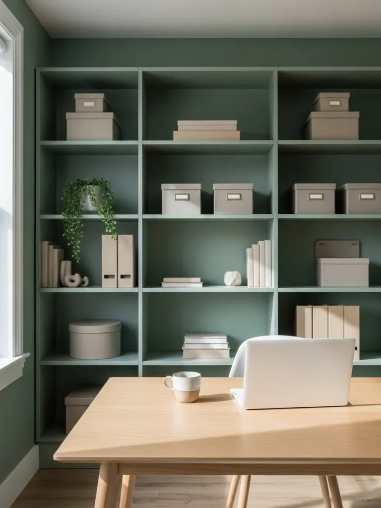 This home office design leans into soft sage green walls paired with full height built in shelving that instantly makes the space feel organized and calm. The shelves are styled with neutral storage boxes, simple books, and a touch of greenery that keeps everything from feeling too stiff. A light wood desk warms things up and adds contrast against the cool green backdrop, while natural light from the window keeps the whole room feeling fresh and airy. Everything feels intentional but not overdone, which is exactly what you want in a space meant for focus.