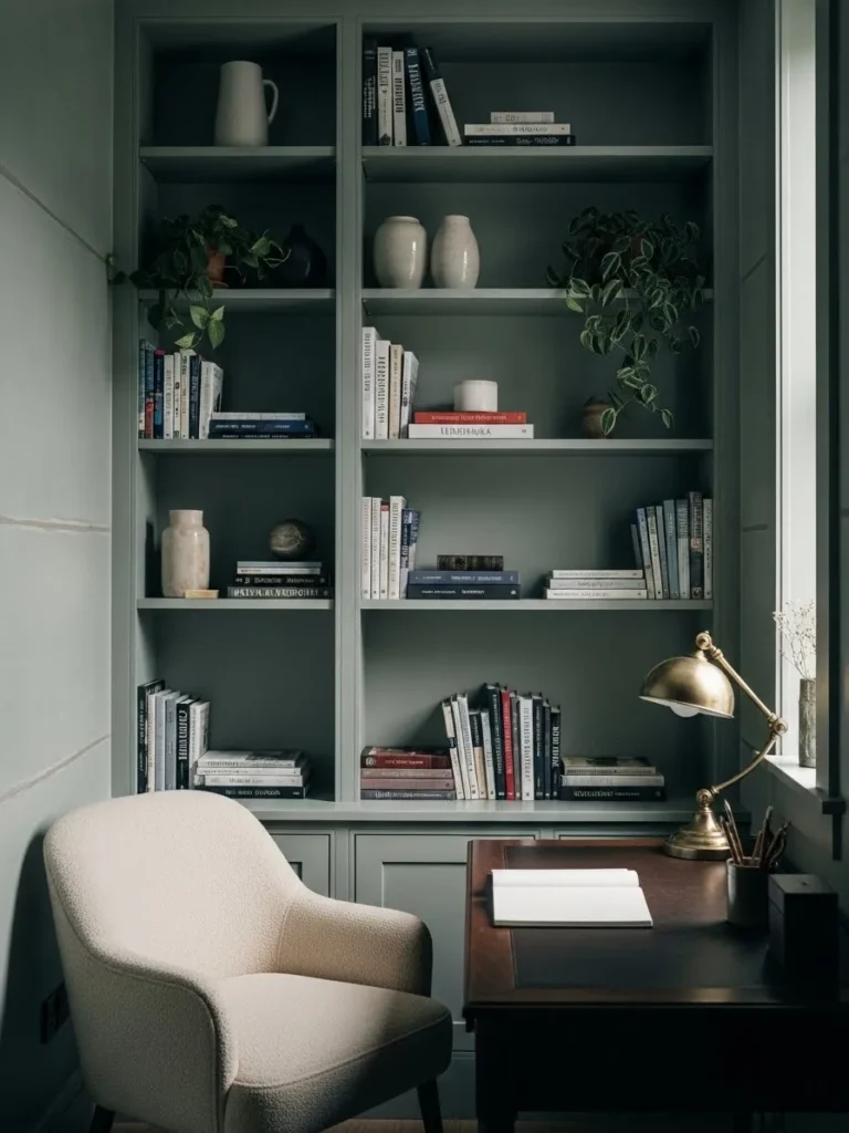 This home office features a soft sage green paint wrapped around beautiful built in shelves that instantly make the space feel calm and collected. The shelving is styled with a thoughtful mix of books, ceramic vases, and trailing greenery which keeps it from feeling too formal or stiff. A warm wood desk adds contrast and grounds the space, while the creamy upholstered chair softens the look and invites you to actually sit down and stay awhile. Natural light sneaks in from the side window, bouncing gently off the sage walls and giving the whole room that quiet morning glow we all secretly want during the workday.
