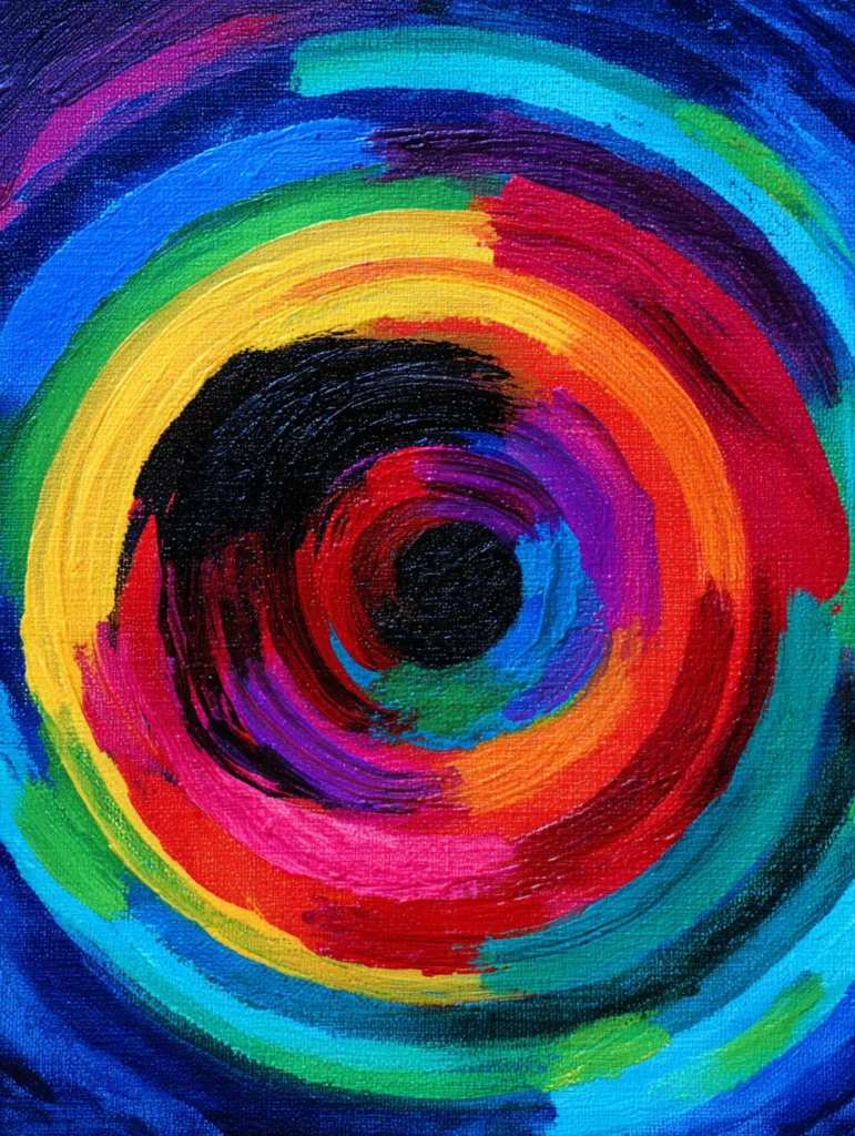 This bold piece highlights a series of concentric circles radiating from a deep black center, creating a hypnotic and dynamic visual effect. The composition uses thick, visible brushstrokes in a spectrum of saturated colors like hot pink, sunshine yellow, bright orange, and electric blue, all layered against one another to build texture and movement. By keeping the brushstrokes circular, the entire image feels like it is spinning, which pulls the eye toward the center of the canvas. It is a striking example of how simple shapes and high-contrast colors can work together to create something that feels truly alive.