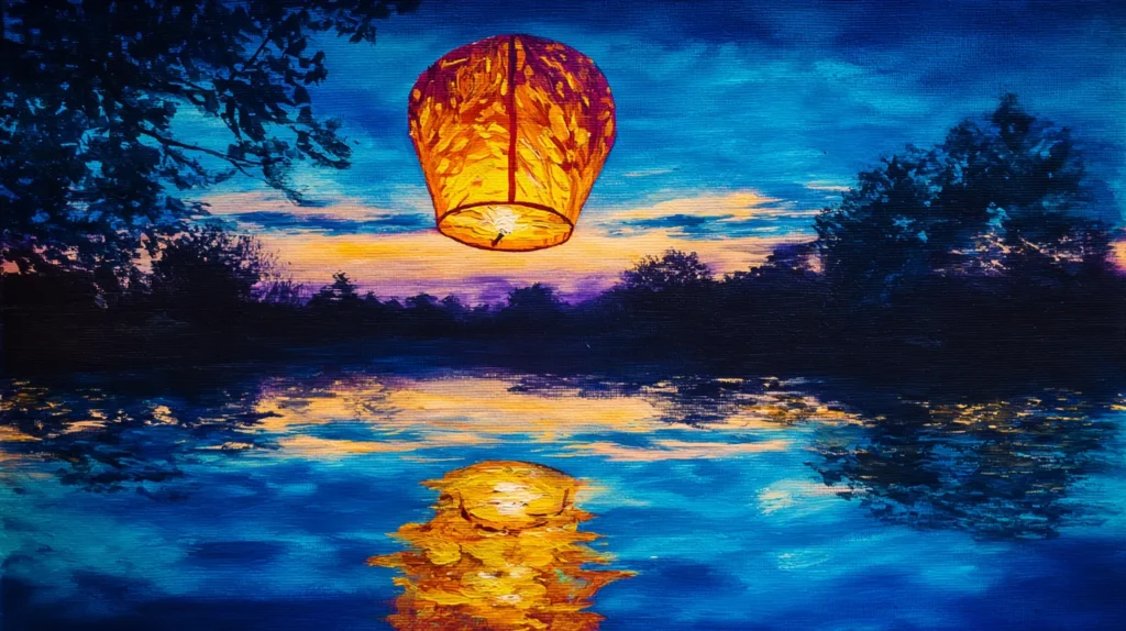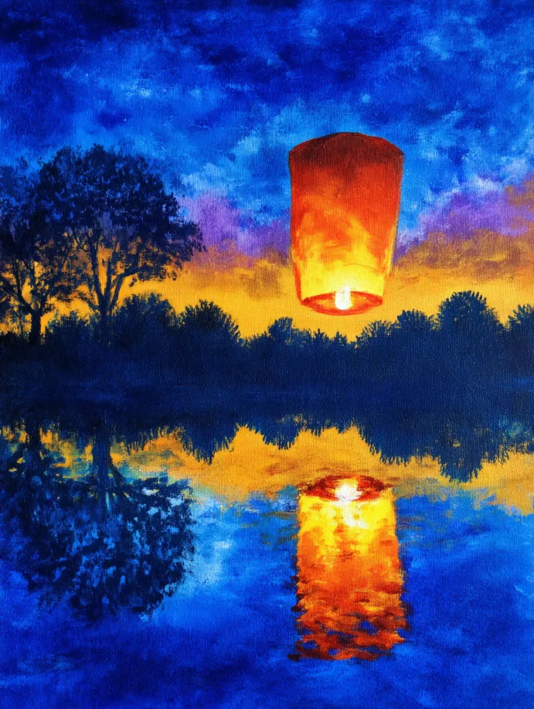 This piece includes a single, warm-toned paper lantern floating against a dramatic night sky filled with deep blues and purples. A thick line of silhouetted trees separates the sky from a calm body of water below, which beautifully reflects both the orange glow of the lantern and the dark forms of the trees. The brush work is energetic and layered, giving the water a rippled effect while the sky has a dreamy, soft quality. It is a stunning study in contrast, pitting the cool, dark tones of the night against the intense, fiery light of the lantern.