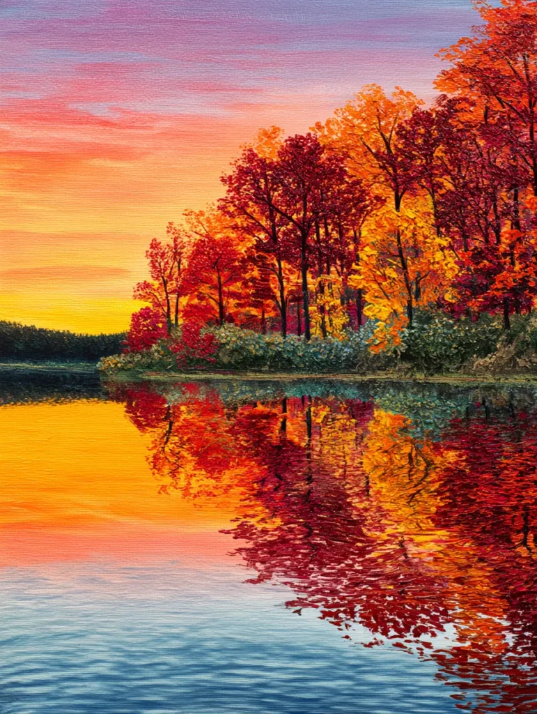 I feel so peaceful just looking at these rich colors because they remind me of cozy sweaters and crisp air. Trying to recreate that water reflection is a wonderful way to play with paint and see how light dances on a surface. It is genuinely fun to use my palette knife or a small brush to get those choppy, colorful marks in the reflection. If you want a painting that feels like a quiet walk through the woods during the best time of year, this project is a total joy.