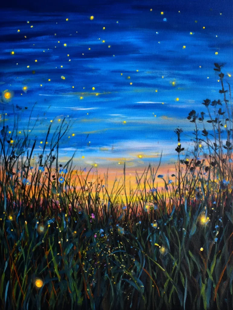 This whimsical painting captures a lush, tall grass meadow at twilight, illuminated by dozens of glowing fireflies. The composition features a low horizon line where a soft, golden sunset meets a deep blue evening sky, creating a beautiful contrast between warm and cool tones. Silhouette-like blades of grass and wildflowers frame the foreground, while tiny, bright yellow dabs of paint are scattered throughout to mimic the dancing light of the fireflies. It creates an enchanting, dreamy atmosphere that feels like a secret moment caught in nature.