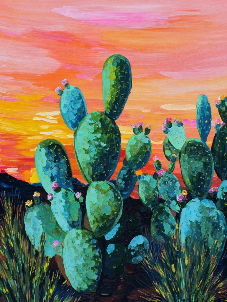 This lively piece features a striking patch of prickly pear cacti standing in the foreground, contrasted against a brilliant, painterly desert sunset. The composition uses a rich palette of deep sea-foam and emerald greens for the cacti pads, which are dotted with tiny, textured touches of pink to represent delicate blooms. The background is a warm gradient of peach, orange, and soft pink, which provides a dramatic backdrop that makes the cool-toned cacti stand out beautifully. Rough, expressive brushstrokes give the plants a sense of weight and texture that feels both rustic and full of life.