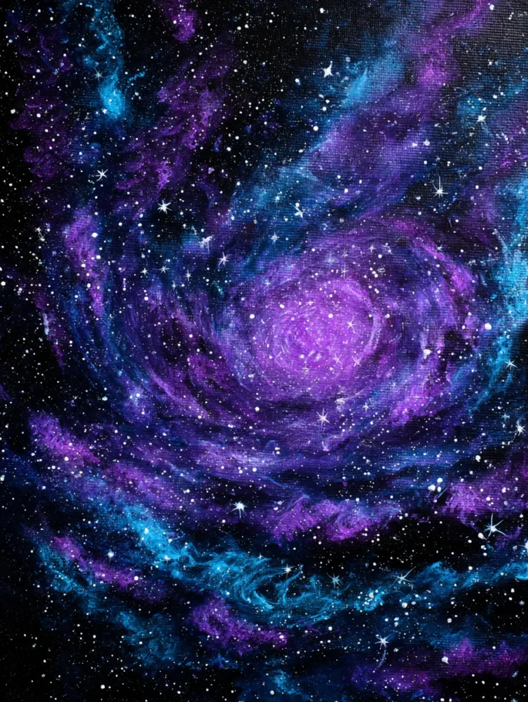 This captivating painting explores the vastness of a spiral galaxy filled with rich, moody tones of violet, indigo, and bright electric blue. The composition focuses on a central, glowing core that radiates outward in swirling arms of stardust and cosmic gas. Fine, crisp white splatters of paint create a dense field of stars against the deep black background, while layered brush strokes in purple and teal add a sense of depth and movement to the swirling nebula. The whole scene feels like a breathtaking glimpse into the mysteries of the night sky.