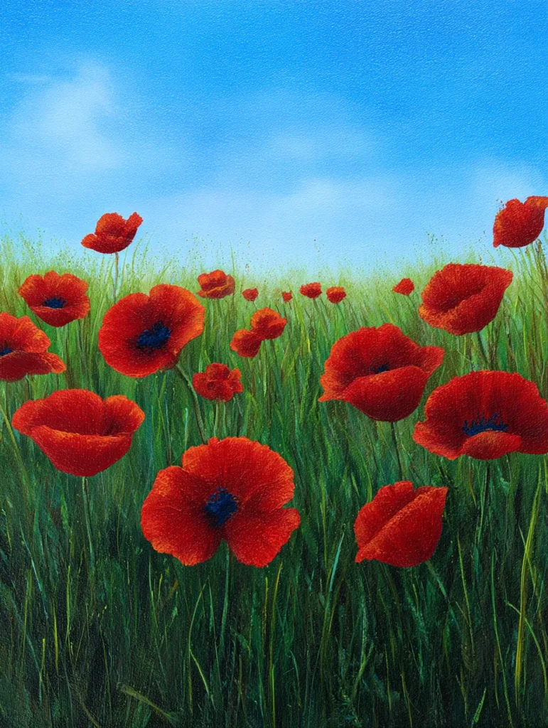This painting captures a sprawling field of bright red poppies swaying in a grassy meadow under a clear, soft-blue sky. The composition uses a wonderful sense of scale, with larger, detailed poppies in the foreground and smaller, delicate blossoms dotting the distance, which draws the viewer into the scene. The poppies are painted with rich, textured strokes of crimson and deep scarlet, featuring dark centers that make them stand out against the variety of green grasses beneath. The sky above is a smooth, gentle gradient, providing a calm backdrop that lets the boldness of the flowers take center stage.