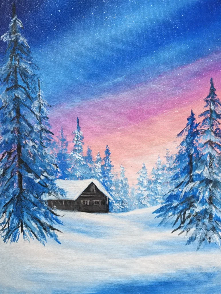 Painting this snowy retreat is such a wonderful way to relax and embrace those cozy vibes. I love focusing on the contrast between the deep, cool shadows in the snow and the soft light in the sky, as it really makes the whole scene feel peaceful. It is honestly so satisfying to paint those frosty evergreens and imagine sitting by a fire inside that little cabin. If you want a project that feels calm and magical, this is a fantastic choice to add to your list.