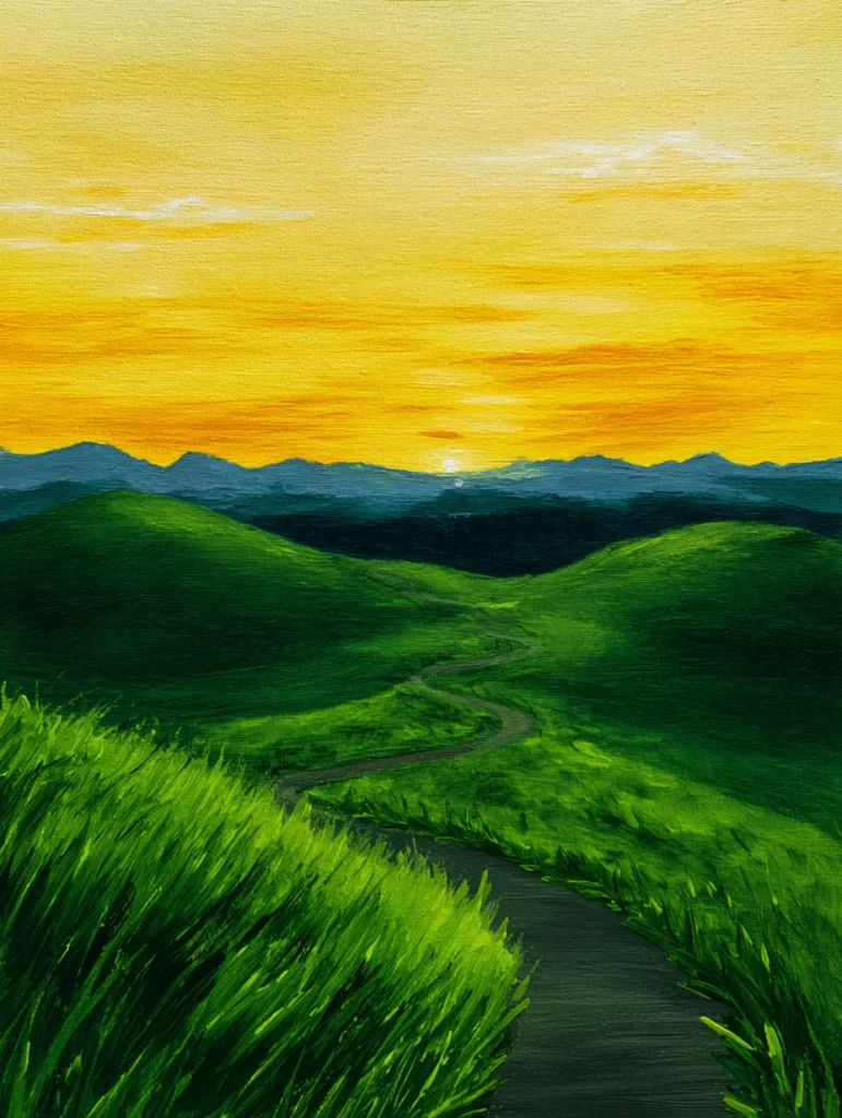 This painting features a vibrant landscape where a winding dirt path leads the eye through rolling, lush green hills toward a distant mountain range. The sky is a brilliant gradient of warm yellows and soft oranges, suggesting a bright sunrise or sunset that illuminates the scene. Bold brush strokes bring texture to the tall grass in the foreground, while the smoother application of paint on the mountains and sky creates a nice sense of depth. The overall composition feels expansive, inviting you to imagine yourself walking down that little path to see what is over the horizon.