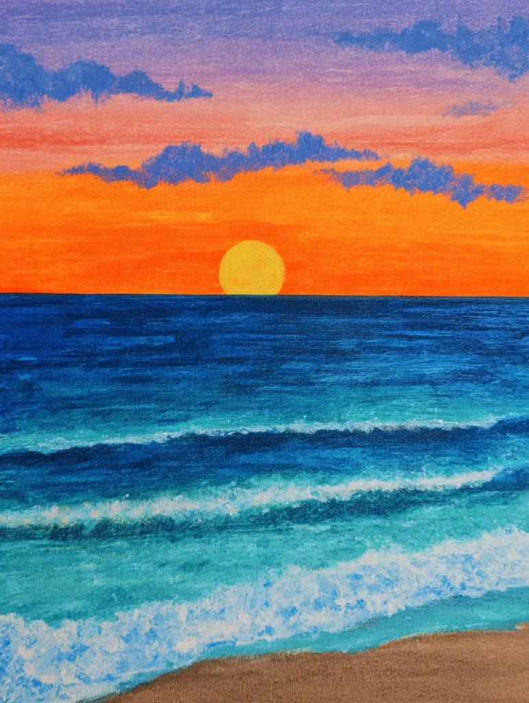 Creating a piece like this is such a soothing activity after a long day. I love how simple it is to blend the sunset colors because you can just layer the paint until it looks dreamy. It gives me a wonderful sense of calm to paint the rhythmic white foam of the waves hitting the sand. You will find that this project is a great way to experiment with color gradients and learn how to make your painting feel alive and warm.