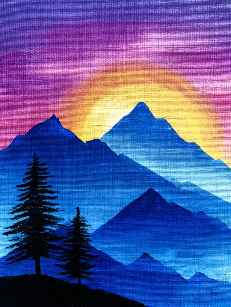 Painting this layered landscape feels like taking a deep breath of fresh air. It is a wonderful project for working on atmospheric perspective because you get to play with how different shades of blue can make objects look far away. I find this process incredibly therapeutic, especially when focusing on those crisp silhouettes against the colorful glow of the sky. If you want a painting that feels like a quiet evening retreat, this one is a total winner.