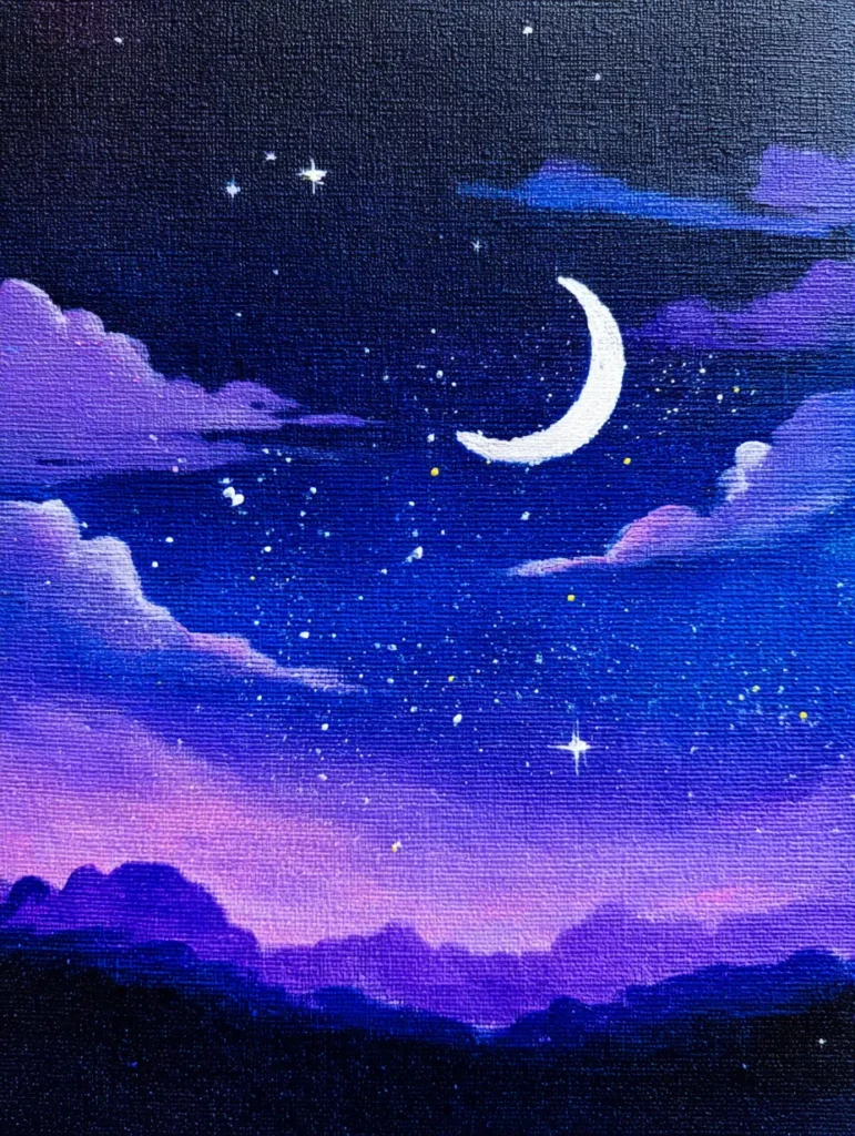 This enchanting scene includes a deep indigo night sky filled with soft violet clouds and a bright, glowing crescent moon. The composition uses a vertical layout, with dark, rolling hills silhouetted at the bottom and a field of delicate, speckled stars scattered across the canvas. Rich shades of purple and royal blue create a smooth gradient that makes the white moon and shimmering stars pop. The overall feel is one of quiet wonder, as if the viewer is looking out a window at a peaceful, magical evening.