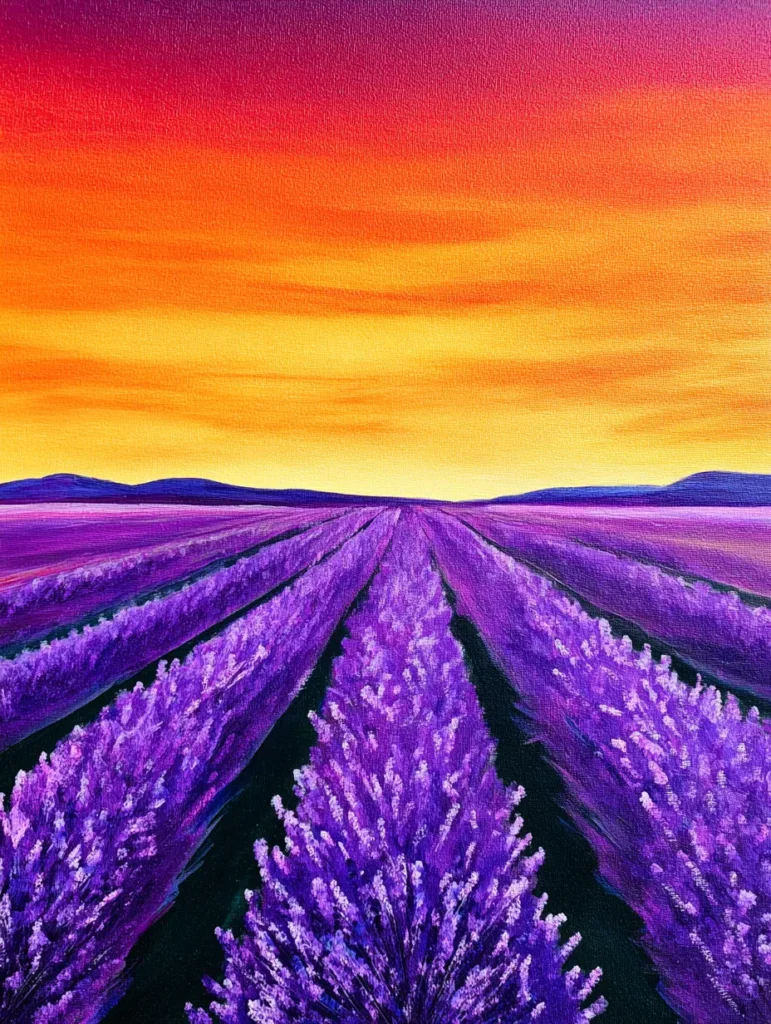 I find that working on this painting is a fantastic way to practice creating depth in a landscape. Painting the long, receding rows is such an engaging process, and it helps me focus on how colors change as they get further away. Whenever I need a moment of zen, the repetitive motion of dabbing on those purple flower heads is my go-to strategy for staying grounded. You will discover that this project is a wonderful opportunity to play with color theory and see how two opposite palettes can look so good together.