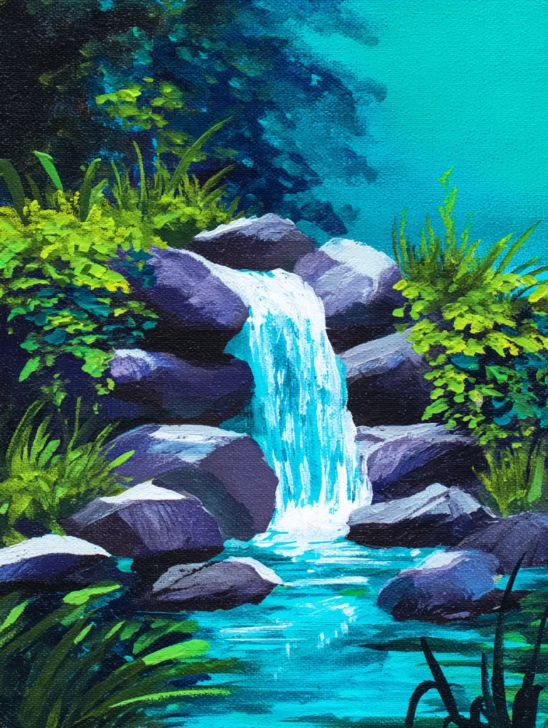 Working on a nature scene like this is such a refreshing break from the usual routine. I love how simple it is to use bright blue and white paint to make the water look like it is truly sparkling and moving. It feels incredibly grounding to focus on those dark shadows in the rock formations, which really help the bright greens and blues pop. If you want a project that makes you feel like you are stepping into a peaceful forest, this is definitely one to try.