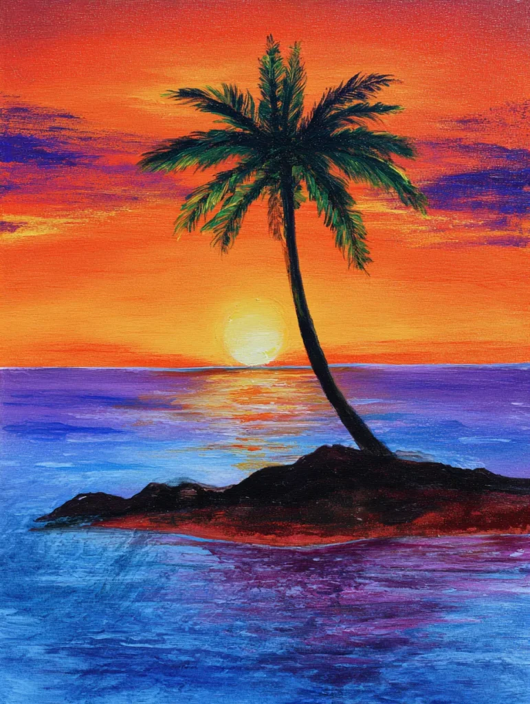 This warm and inviting scene features a solitary palm tree standing on a tiny dark island, set against a brilliant, fiery horizon. The sky is a gradient of intense orange and red, while the ocean below reflects those same colors along with deep purples and blues. The composition places the sun just above the waterline, creating a soft, glowing reflection that leads the eye toward the center of the canvas. You can see quick, feathery brushstrokes forming the palm fronds, which creates a lovely contrast against the smooth, blended background of the sky and sea.