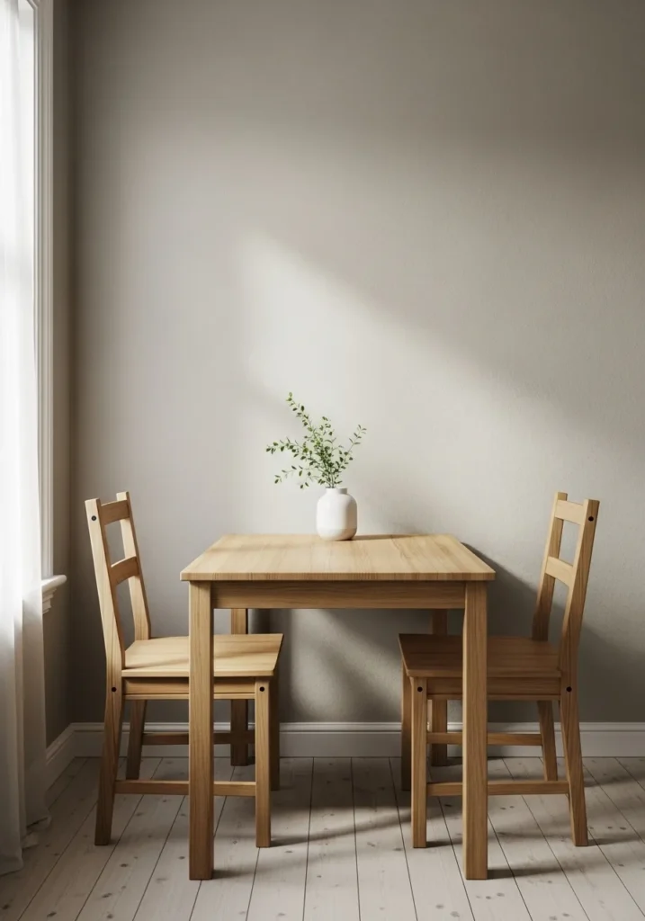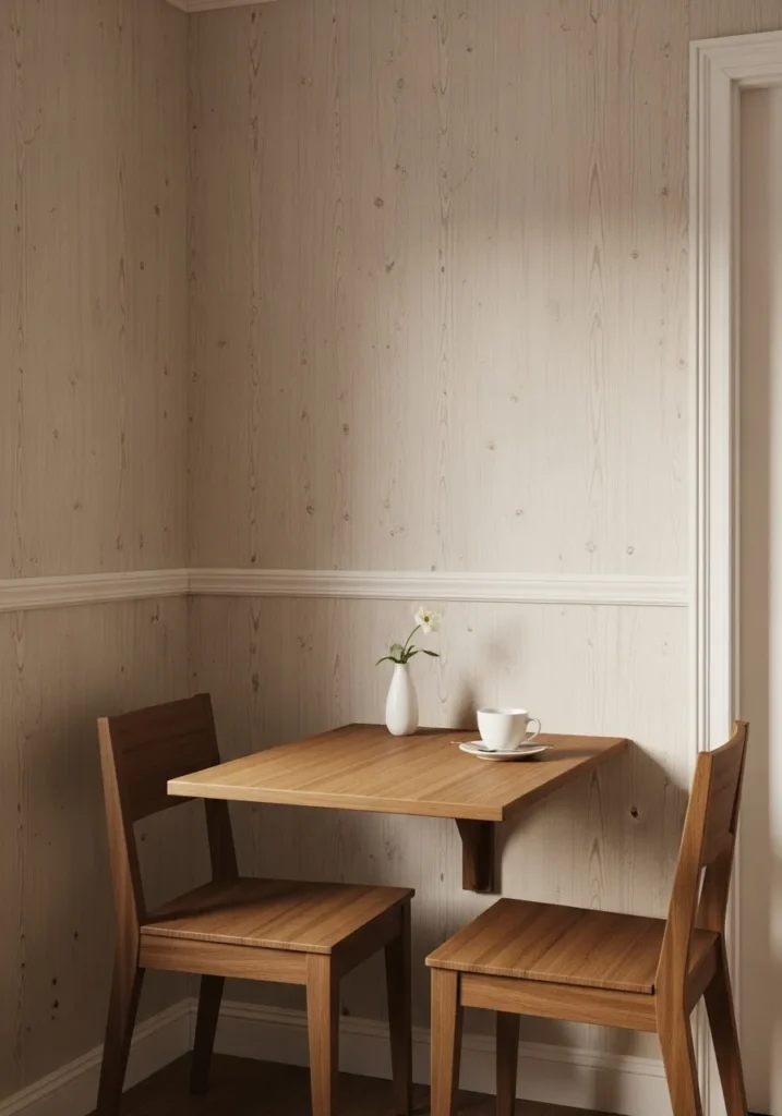 This small dining space uses light neutral walls that bounce daylight around the room and instantly make it feel wider. The pale paint blends softly into the trim which helps blur the edges and reduces visual breaks. A compact wooden table and slim chairs keep the footprint small while still feeling functional and cozy. Everything feels tucked in yet open at the same time which is exactly what a tiny dining area needs.