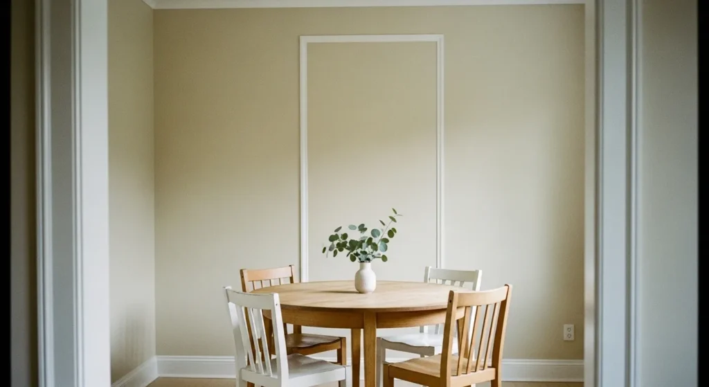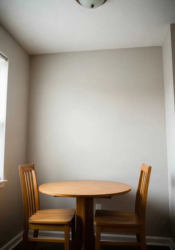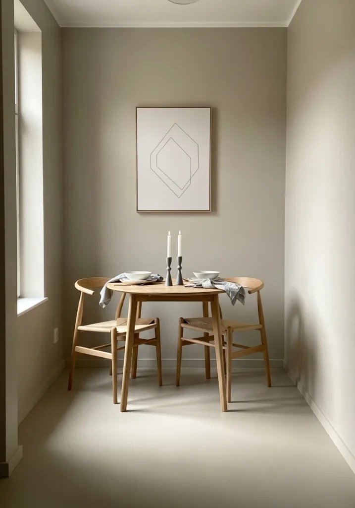This small dining space uses soft greige walls that gently reflect natural light and help the room feel wider. The neutral paint blends smoothly with the ceiling and trim which keeps the edges soft and unobtrusive. A compact wooden table and straight backed chairs fit neatly without overwhelming the room. The overall look feels calm and uncluttered which makes the space feel larger than it actually is.