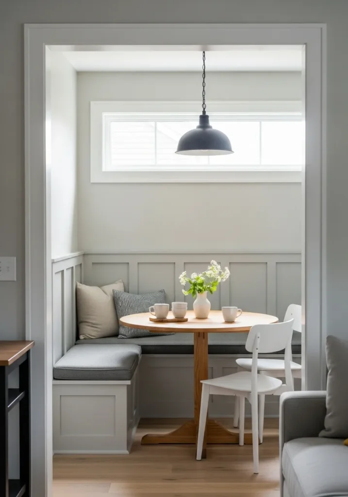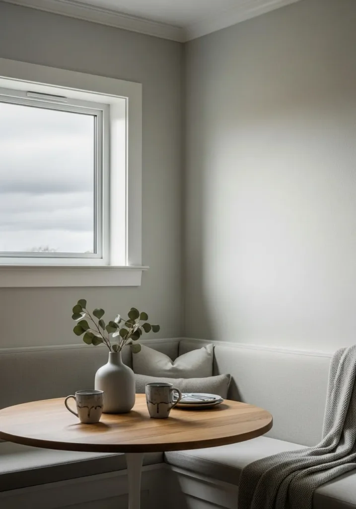 This dining nook features light gray walls that visually recede and create an airy feel. The soft gray tone pairs beautifully with the window light and keeps the space feeling fresh. Built in seating and a small round table make the most of every inch without clutter. The calm color palette keeps the room feeling open and relaxed.