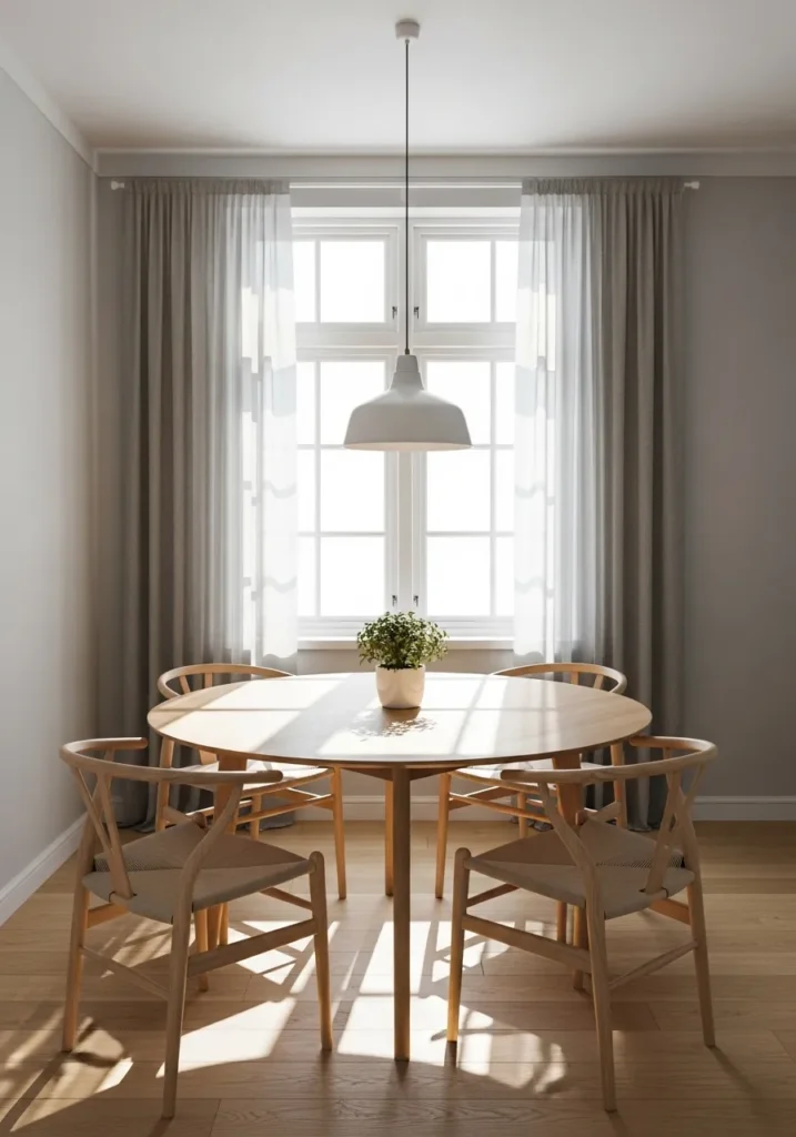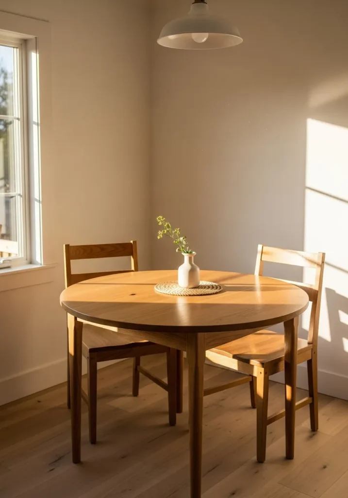 This dining area uses warm neutral walls to soften the space and reflect sunlight evenly. The round table helps the room feel more fluid and easier to move through. Light wood tones blend gently with the walls which reduces visual contrast. Everything feels balanced and open without feeling plain.