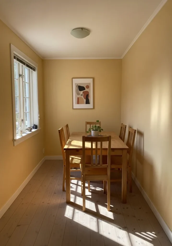 This small dining room features soft golden beige walls that brighten the space without overpowering it. The warm tone reflects daylight and adds depth while still keeping the room open. Simple wooden furniture sits lightly in the room and leaves plenty of visual breathing room. The narrow layout feels taller and more inviting thanks to the paint choice.