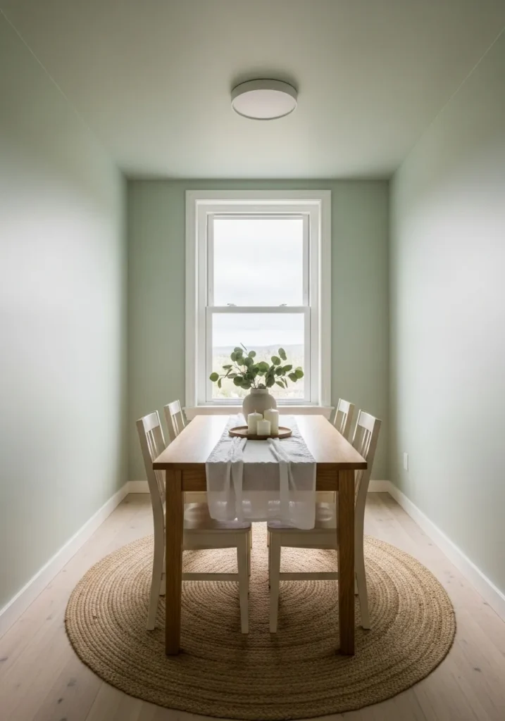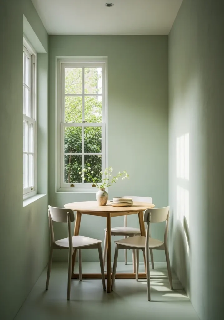 This small dining room uses soft sage green walls to create a calm and spacious feeling. The muted green reflects daylight gently and helps the walls visually pull back. A round white table paired with light wood chairs keeps the look airy and uncluttered. The simple palette allows the room to feel open without losing warmth.