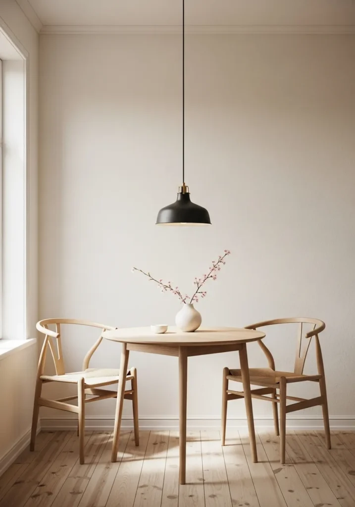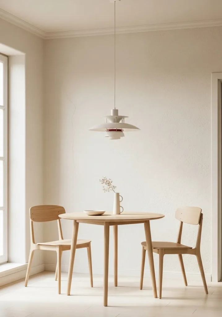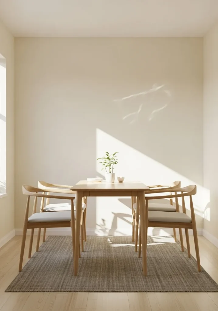 This dining room uses creamy neutral walls to maximize light and reduce visual boundaries. The paint blends seamlessly with the ceiling which helps the room feel taller. A simple pendant light and light wood furniture keep the space open and uncluttered. Everything feels soft and balanced without unnecessary details.