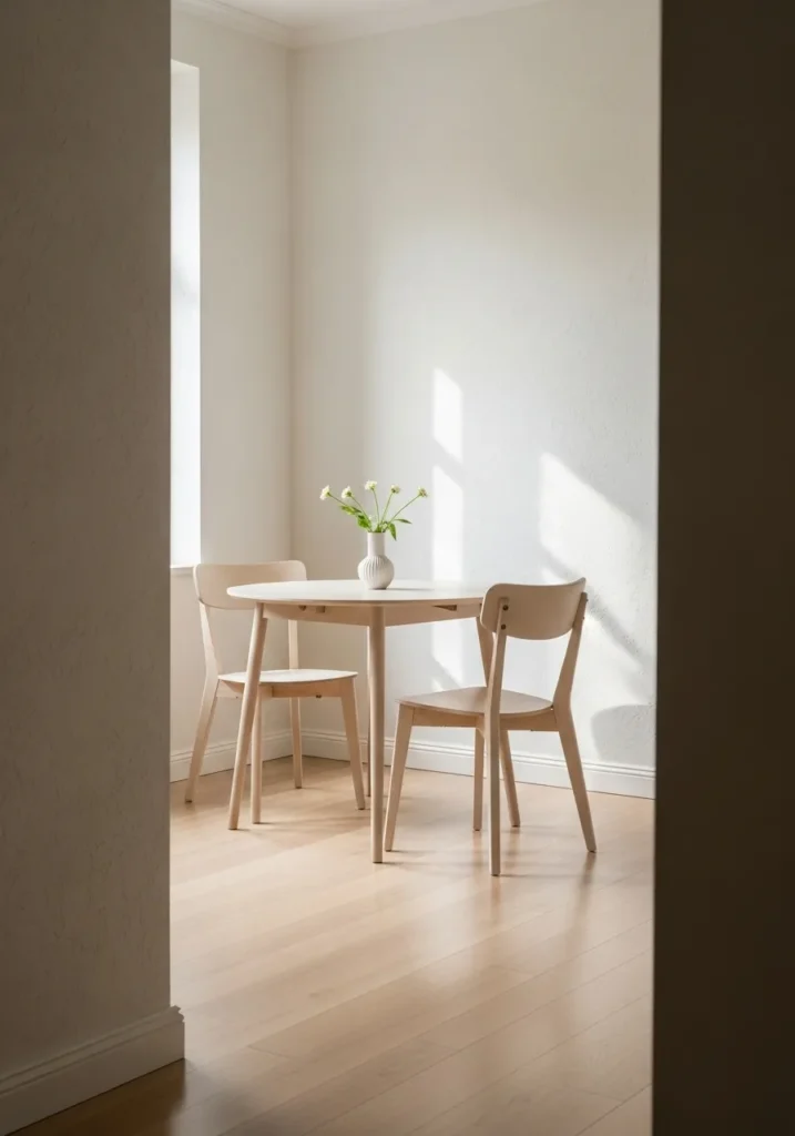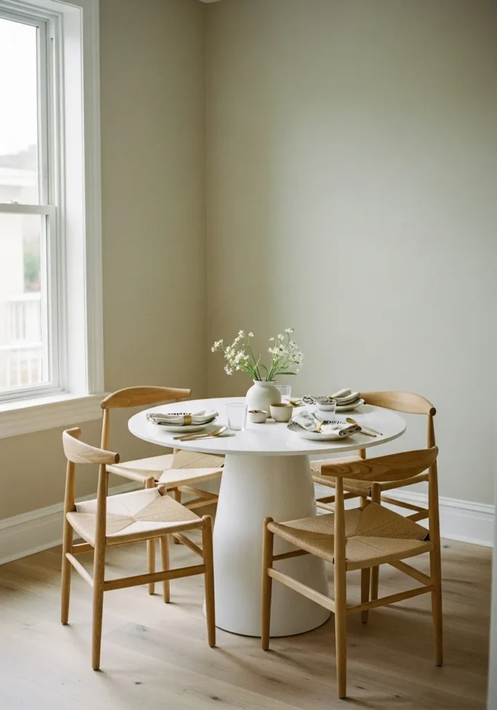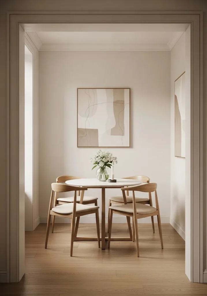This small dining room uses creamy off white walls to maximize light and create a seamless look. The soft paint blends smoothly with the ceiling and trim which helps erase harsh lines. A small round table and classic wooden chairs keep the space functional without crowding it. Everything feels clean and open with no visual clutter.