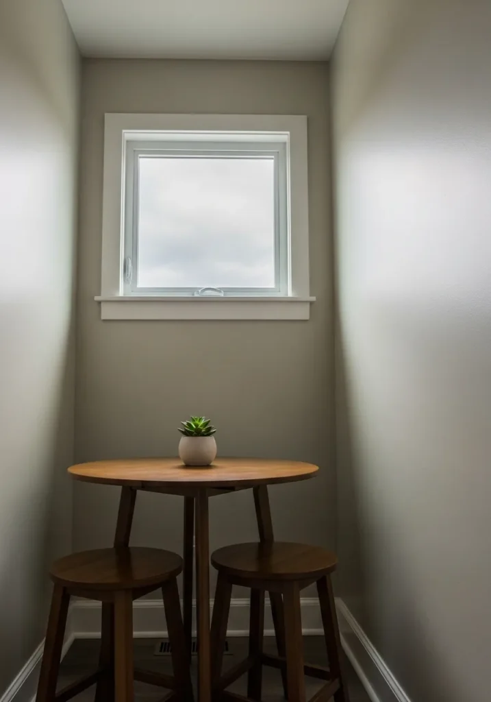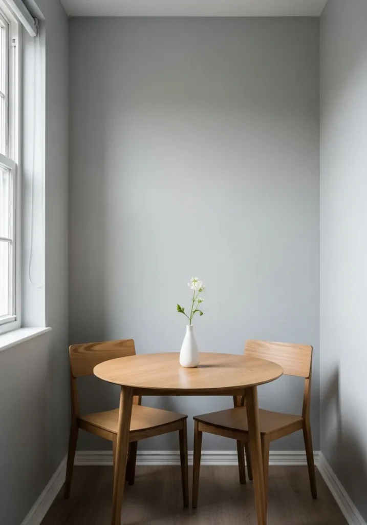 This dining nook features cool gray walls that make the space feel taller and more open. The color keeps the walls subtle and allows natural light to bounce around the room. A small round wood table fits perfectly and leaves clear space around it. Everything feels neat and balanced without visual noise.