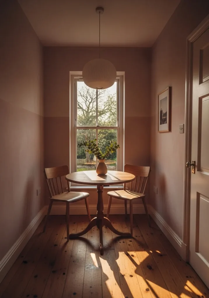 This small dining room uses pale warm walls to soften the angles of the room and make it feel more spacious. The light paint color blends smoothly with the ceiling and floor which reduces harsh visual lines. A compact table and chairs fit comfortably without crowding the room. Sunlight adds a gentle glow that enhances the sense of openness.