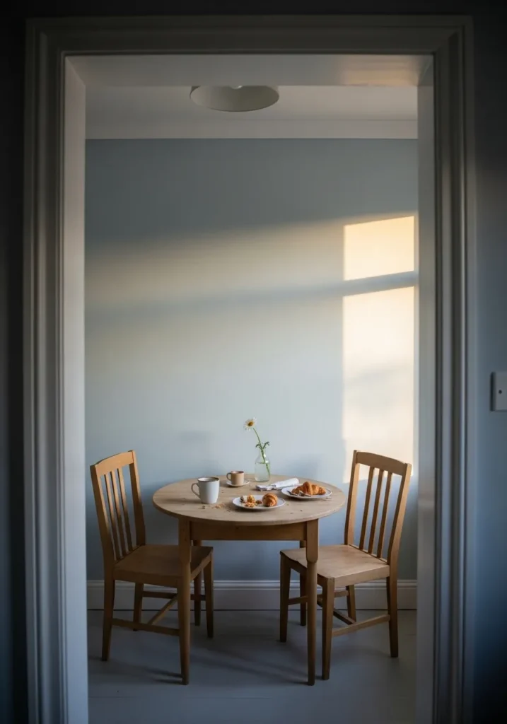This dining nook uses muted blue gray walls to create depth without shrinking the space. The color feels soft and slightly cool which helps the walls recede visually. A small round table and classic wooden chairs fit neatly into the corner and keep the layout efficient. The doorway framing adds charm while still allowing light to flow through.