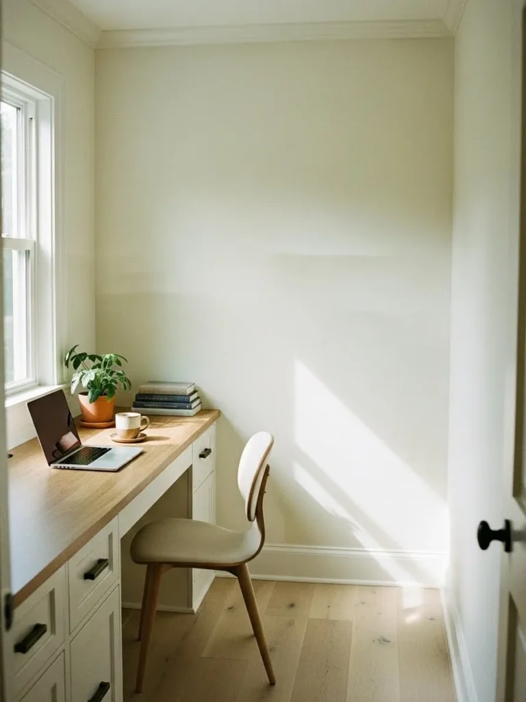 This small home office keeps things light and airy with soft cream walls that reflect every bit of natural light coming in through the window. The paint color feels warm without going yellow, which instantly makes the room feel taller and more open. A simple built in desk with a light wood top adds warmth and contrast, while the pale flooring keeps everything feeling cohesive and uncluttered. I love how the space leans into minimal styling with just a plant, a few books, and everyday essentials, letting the wall color do most of the heavy lifting when it comes to making the room feel bigger.