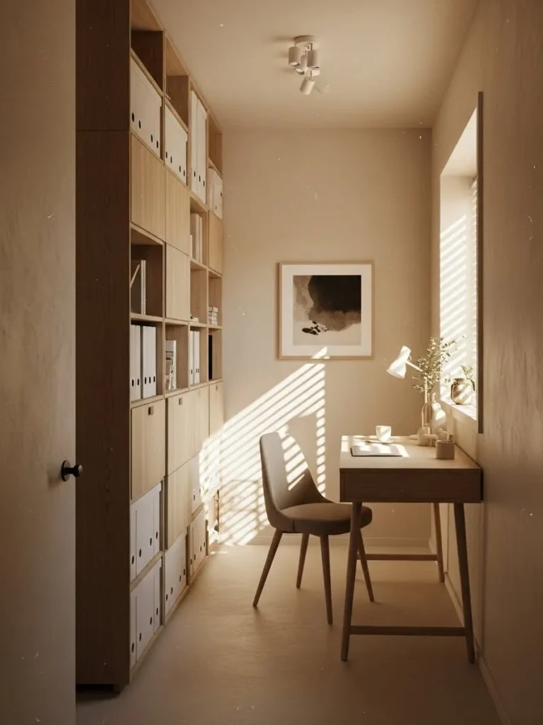 This small home office leans into soft beige and creamy sand tones that instantly make the space feel brighter and more open. The walls reflect natural light beautifully, especially with the sunlight filtering through the blinds and bouncing across the room. Floor to ceiling built in shelving keeps everything tidy without feeling heavy, thanks to the light wood finish and matching storage boxes. The simple desk and chair combo stays visually light, while the minimal artwork and subtle decor keep the whole space calm and uncluttered.