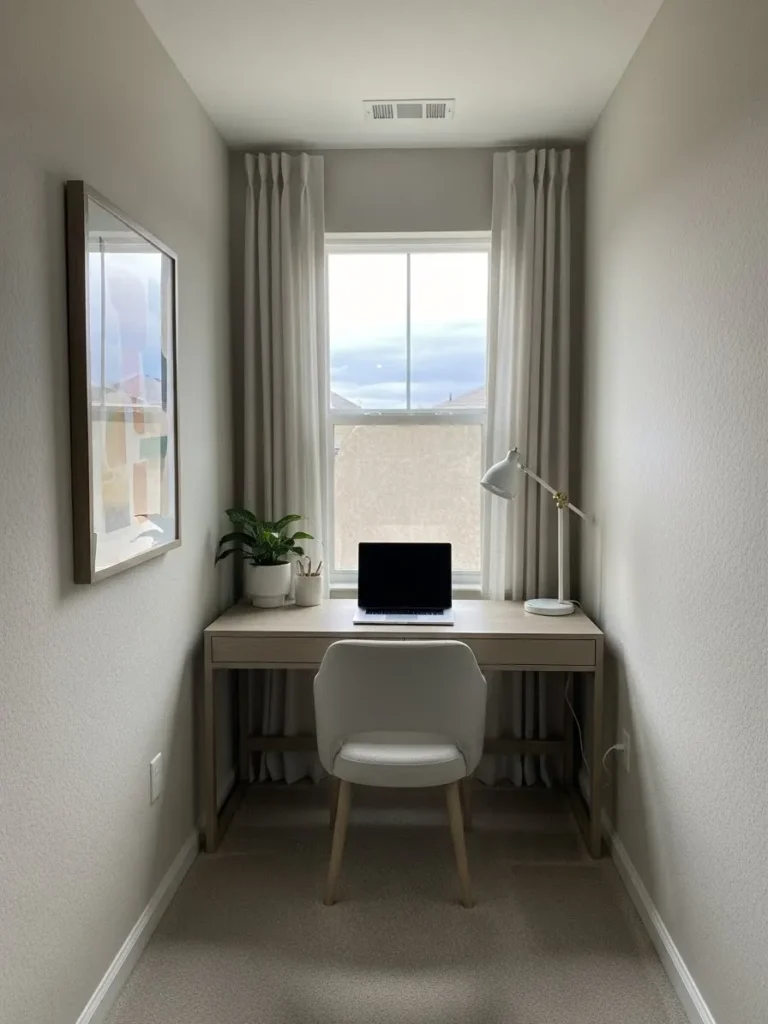 This small office setup keeps things airy and open with soft neutral walls that gently bounce light around the room. The narrow layout is balanced beautifully by the centered desk and large window, which instantly draws the eye forward and makes the space feel longer and taller. Light beige and warm greige tones blend seamlessly with the simple wood desk, white chair, and sheer curtains, creating a calm, uncluttered look. Minimal decor like a single plant, a slim desk lamp, and understated wall art keeps visual noise low, which is key when working with a tight footprint.