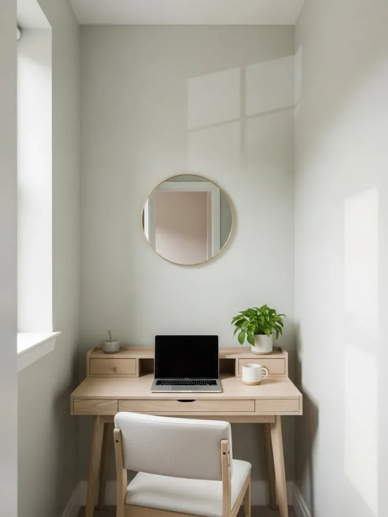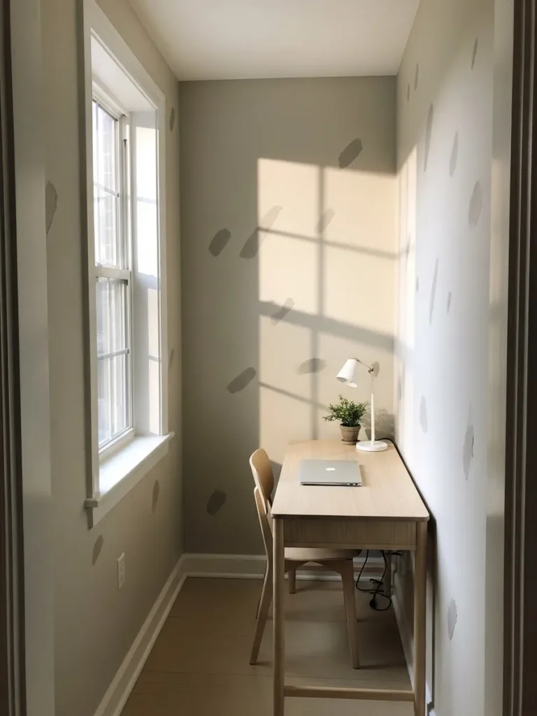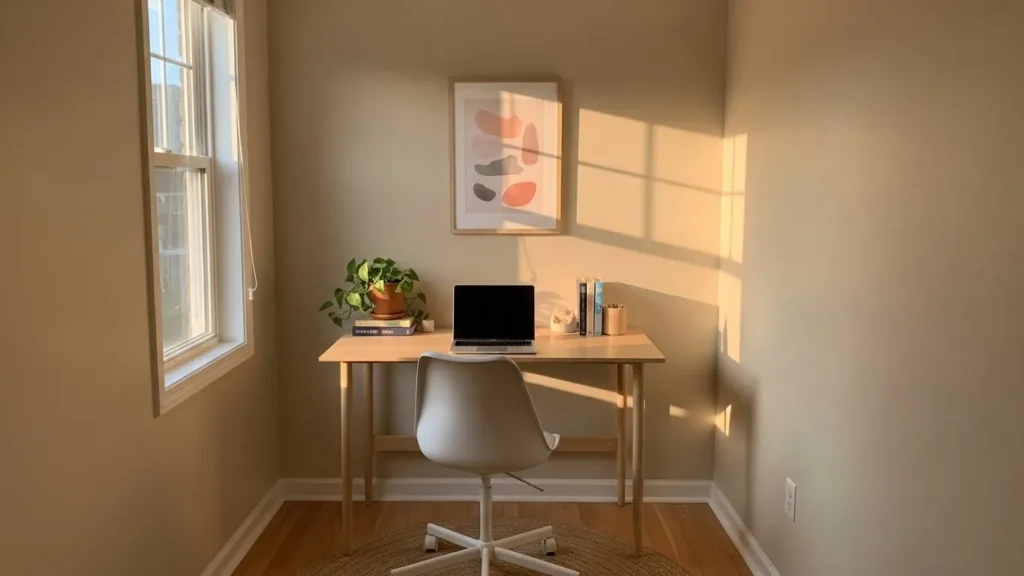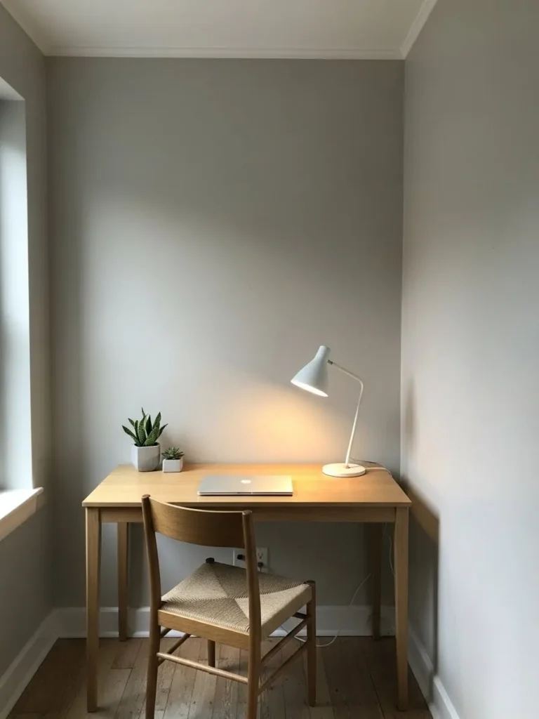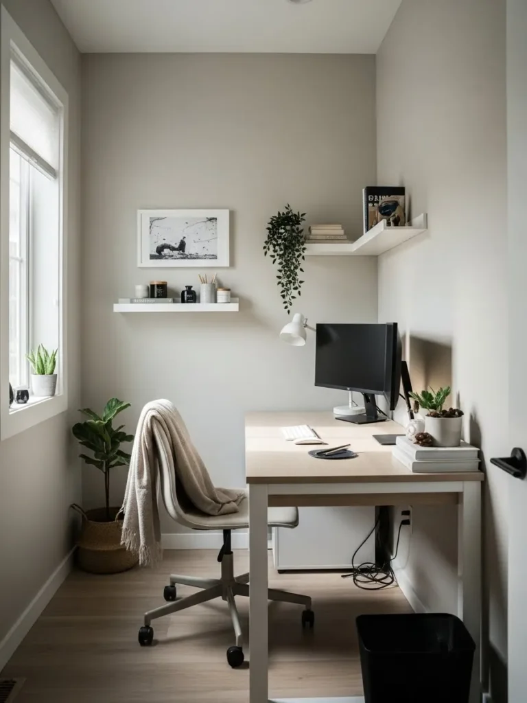This small office setup uses a soft greige wall color that instantly makes the space feel taller, calmer, and more open. The light neutral tone reflects natural daylight from the nearby window, which helps the walls visually recede instead of closing the room in. Paired with simple white trim, warm wood flooring, and a clean-lined desk, the whole corner feels airy without looking cold. The minimal styling, gentle lighting, and uncluttered layout keep the focus on space and light, which is exactly what you want in a compact home office.