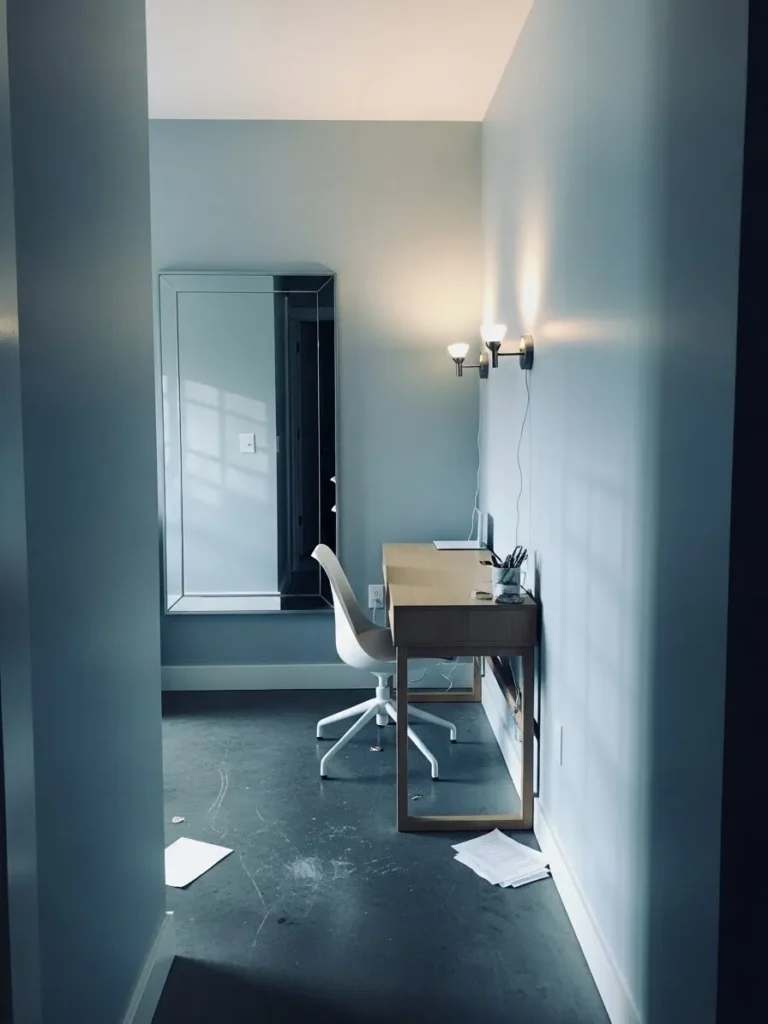 This small office makes the most of a slim layout by keeping everything clean, calm, and visually open. The walls are painted in a soft blue gray that instantly stretches the space and reflects light beautifully. A simple wood desk hugs the wall to save floor space, while the white chair keeps things feeling airy instead of bulky. The wall sconces add gentle lighting without taking up precious surface area, and the tall mirror helps bounce light around so the room feels taller and less boxed in.