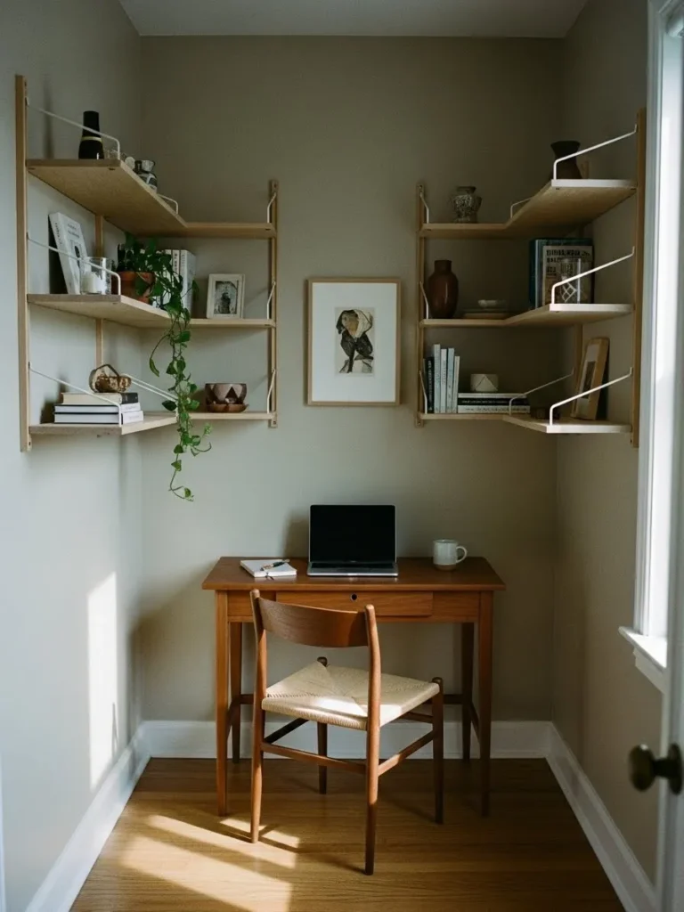 This small office setup uses a soft greige wall color that instantly makes the space feel calmer and more open. The light neutral walls bounce natural light around the room, which is a huge win in a narrow nook like this. A simple wooden desk keeps things visually light, while the matching wood chair adds warmth without overpowering the space. The floating shelves on both sides draw the eye upward and make the walls feel taller, plus they offer storage without bulky furniture eating up floor space. Layered with books, framed art, ceramics, and a trailing plant, the whole setup feels styled but still breathable.