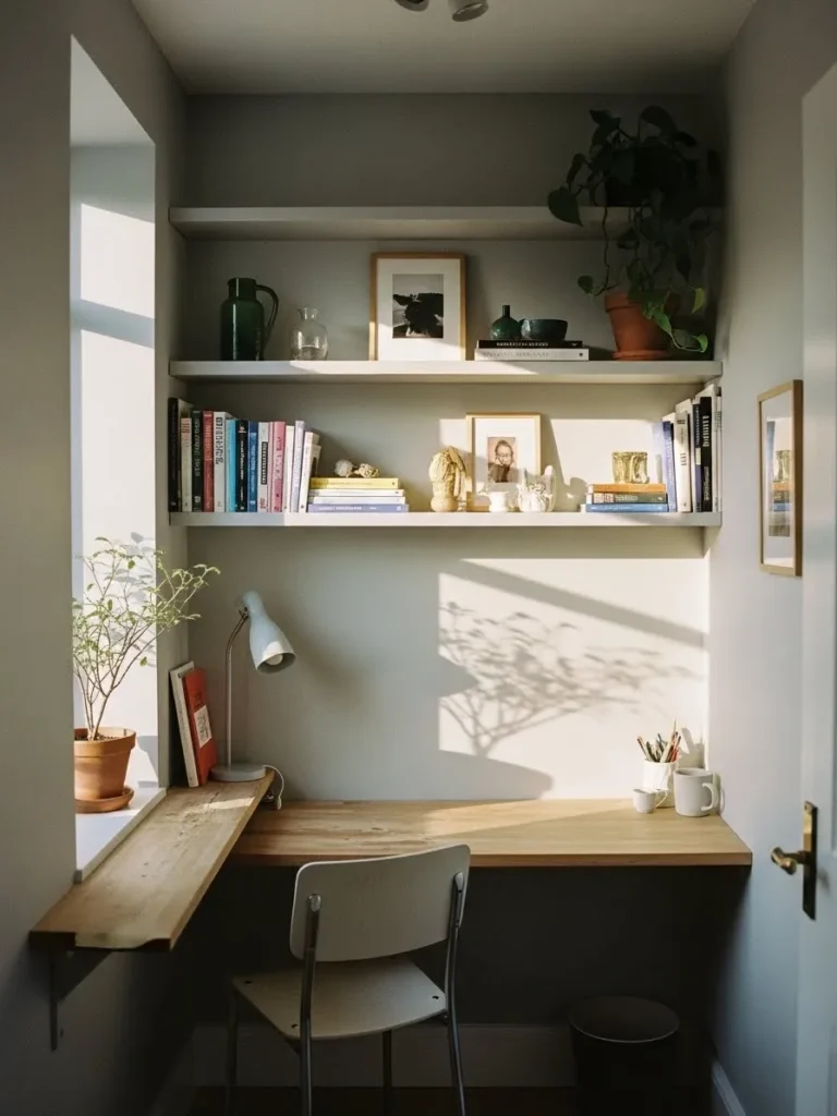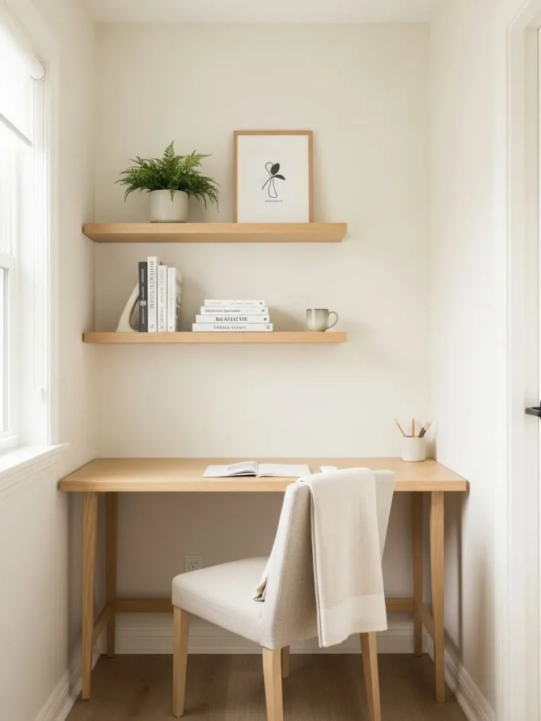 This small office nook keeps things airy and uncluttered with soft white walls that bounce light around beautifully. The built in floating desk feels light and practical without eating up visual space, which is perfect for narrow layouts. Natural wood adds warmth so the room does not feel cold, while the simple black desk lamp gives just enough contrast to keep things interesting. With minimal furniture and clean lines, the whole space feels calm, intentional, and way bigger than it actually is.