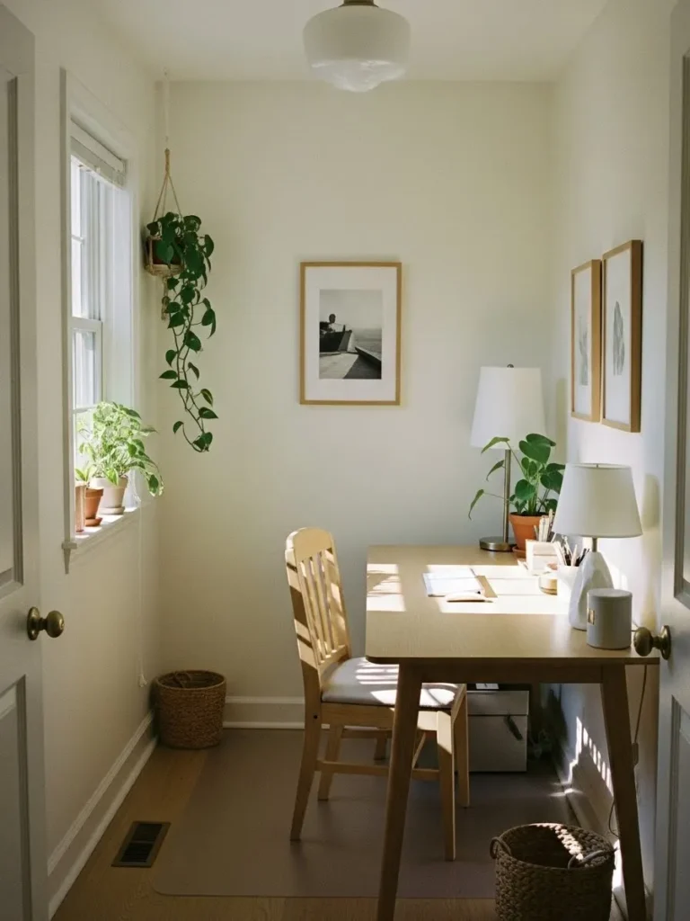 This tiny office nook makes the most of its narrow footprint by keeping everything light and airy. The soft warm neutral wall color reflects natural light beautifully, especially with that generous window bringing sunshine straight onto the desk. A simple light wood desk and matching chair keep the look uncluttered, while the clean lines and minimal decor help the space feel calm instead of cramped. Even the subtle wall detailing adds just enough visual interest without overwhelming the room, which is exactly what a small workspace needs.