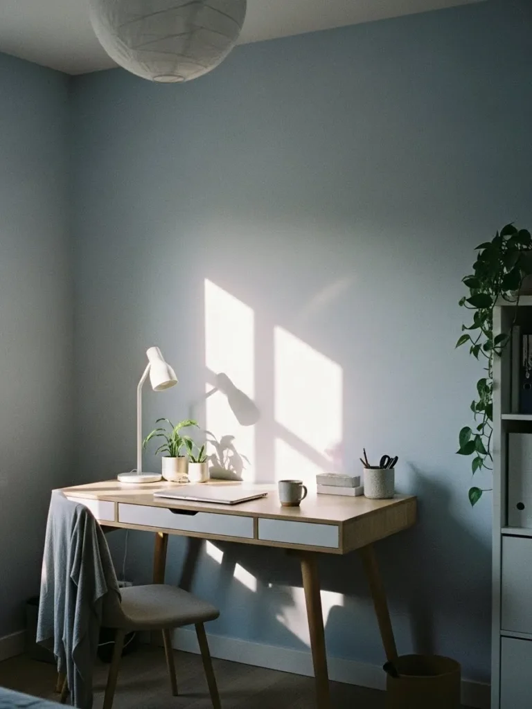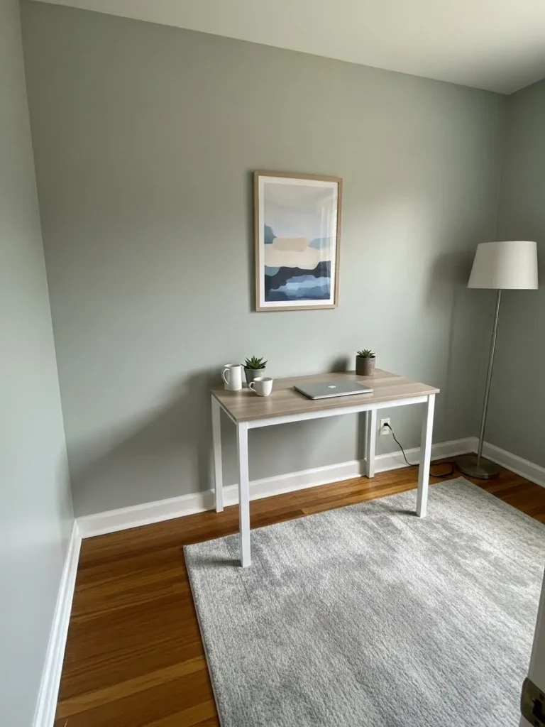 I love this kind of setup because it feels peaceful without trying too hard. The wall color is subtle but still interesting, and it makes the whole room feel fresh and quietly stylish. If you are working with a small office, this is the kind of paint choice that does a lot of heavy lifting without shouting for attention. It feels cozy, organized, and easy to live with, which is exactly what I want when I sit down to get things done.