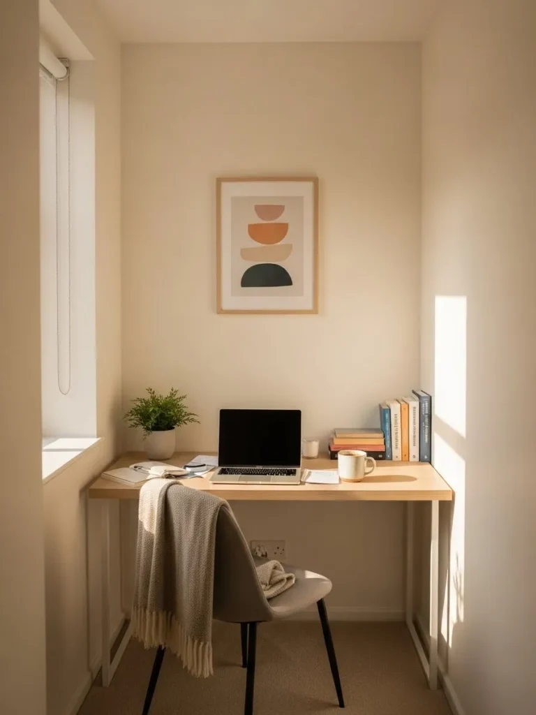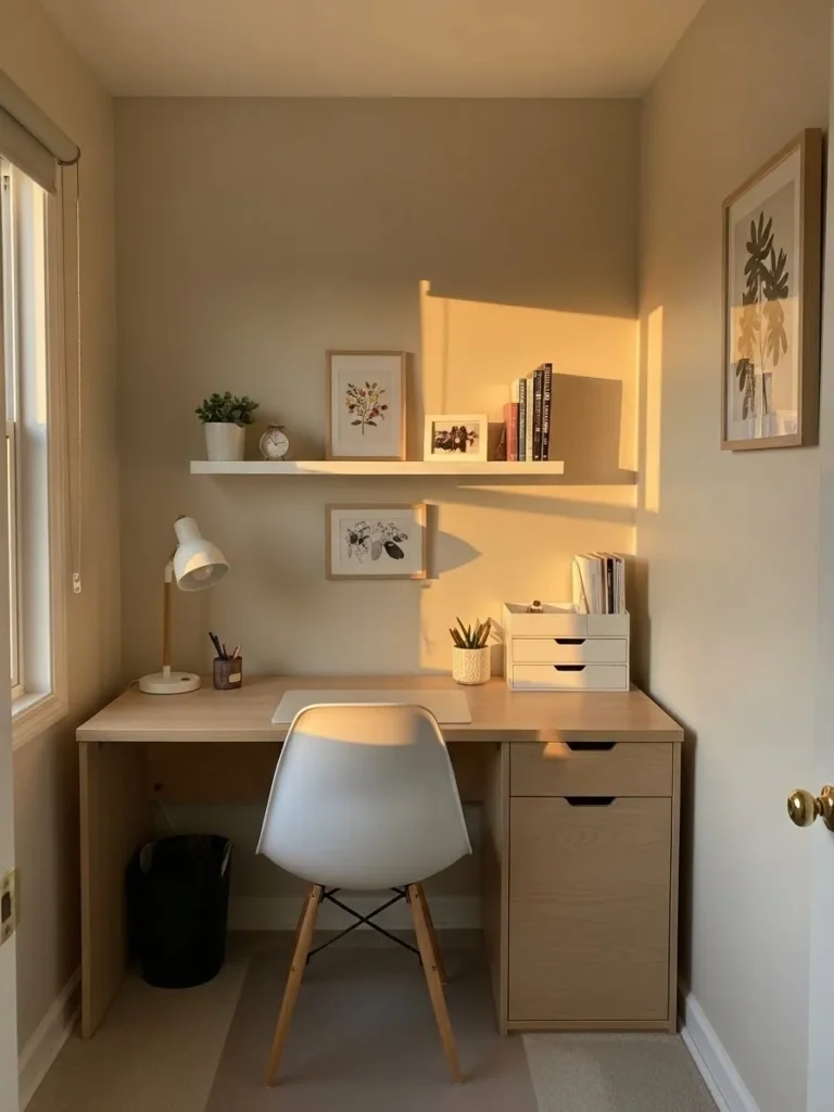 I honestly love how peaceful this setup feels. It looks like the kind of spot where you sit down with your coffee, open your laptop, and suddenly feel way more productive than you expected. The warm neutral paint makes the space feel bigger and brighter without going cold or boring, and that balance is hard to get right. For a small home office, this is one of those designs that proves simple really can be stunning.