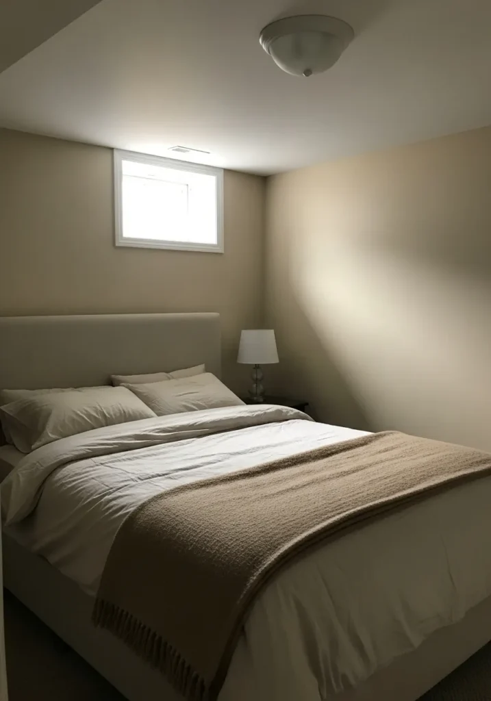This basement bedroom is painted in a warm beige that creates a cozy and restful atmosphere. The color softens the room and works beautifully with layered bedding and warm lighting. Even with limited windows, the space feels inviting.