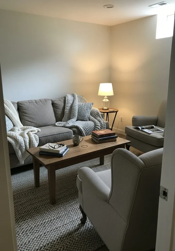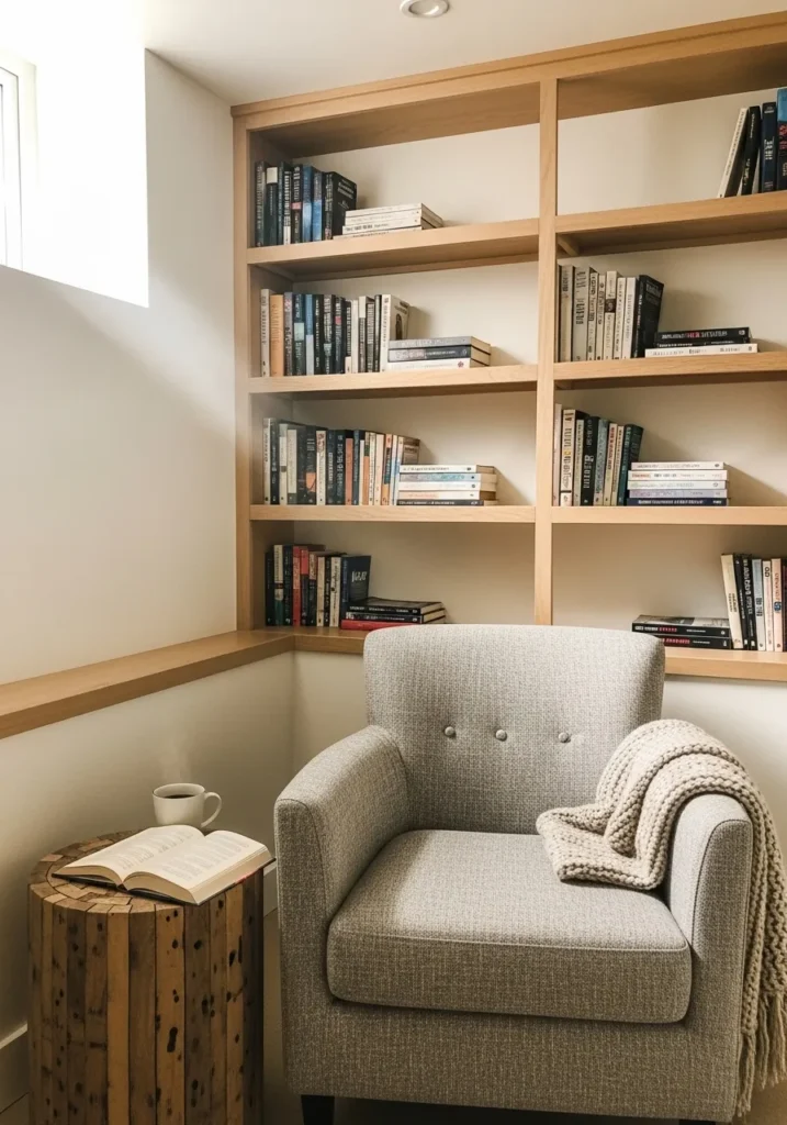 This small basement nook is painted in a pale linen shade that keeps the space feeling bright and calm. The color reflects light beautifully and helps the compact area feel less confined. Simple furniture lets the walls do the work.