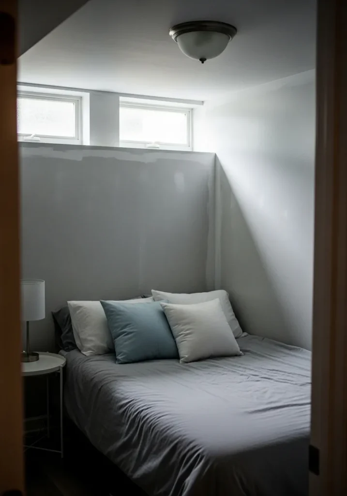 I really like this color choice for a basement bedroom. Off white feels softer than pure white. It creates a peaceful atmosphere that feels perfect for unwinding.