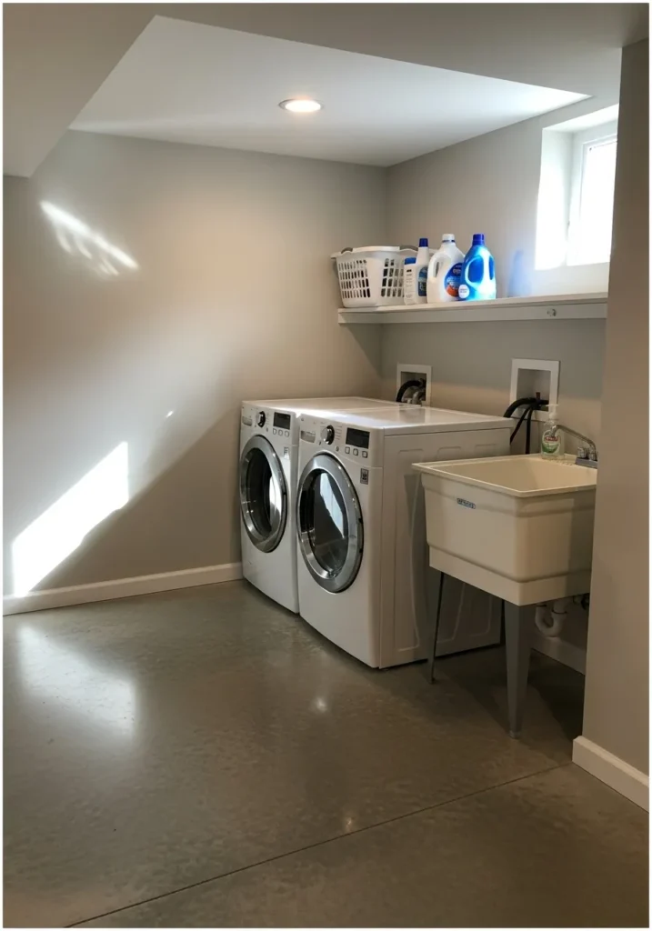 This laundry room is painted in a soft beige tone that brightens the space while keeping it warm. The color reflects overhead lighting nicely and helps the room feel clean and organized. Simple cabinetry and appliances stand out without harsh contrast.