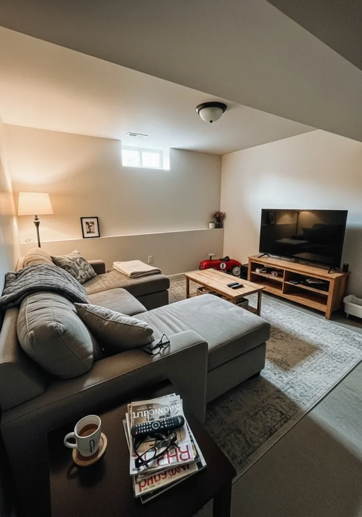 This is one of my favorite looks for a basement. Warm greige never feels cold or flat. It makes movie nights feel cozy and relaxed.