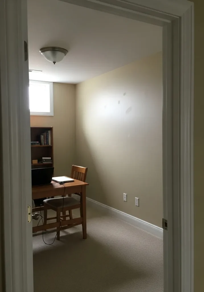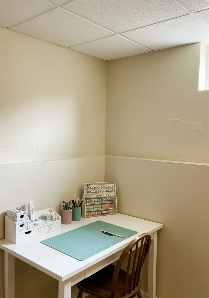 This basement office is painted in a soft greige that reflects light beautifully and keeps the space feeling open. The color works well with the exposed ceiling and simple desk setup, making the room feel brighter without losing warmth. Natural light from the small window spreads gently across the walls.