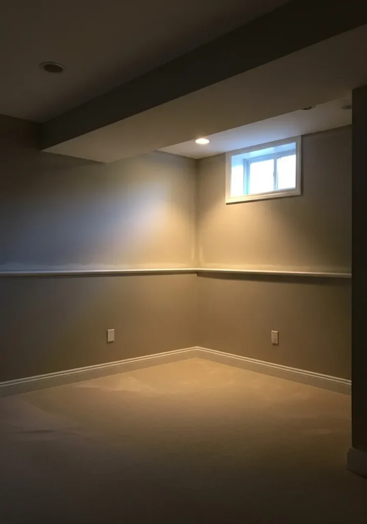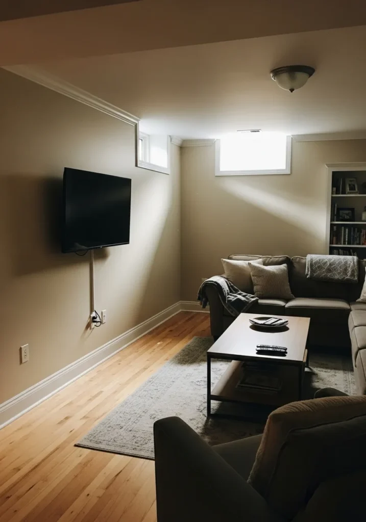 This basement family room features warm neutral walls that reflect light evenly across the space. The color works well with cozy seating, media furniture, and layered textures. Even with limited windows, the room feels open and inviting.
